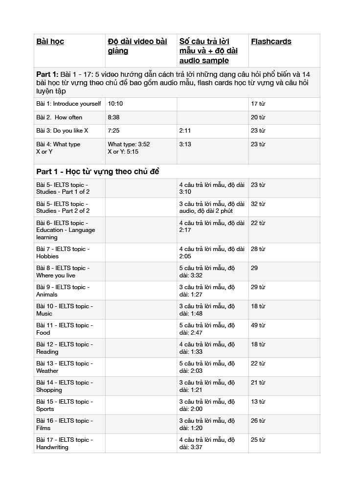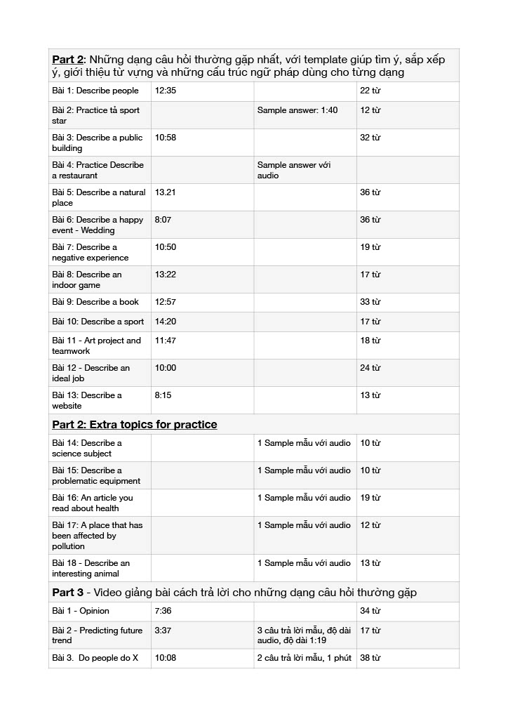 – 40 bài học bao gồm 21 Video giảng và câu trả lời mẫu cho những chủ đề thường gặp nhất trong IELTS Speaking. Mỗi bài học sẽ bài tập trung vào cách trả lời cho những câu hỏi thường gặp cho part 1, 2, 3. Bạn không biết dùng cấu trúc câu hay phát triển ý như thế nào? Khoá học sẽ cung cấp templates, những cấu trúc ngữ pháp cũng như từ vựng để các bạn trả lời câu hỏi cho từng chủ đề.